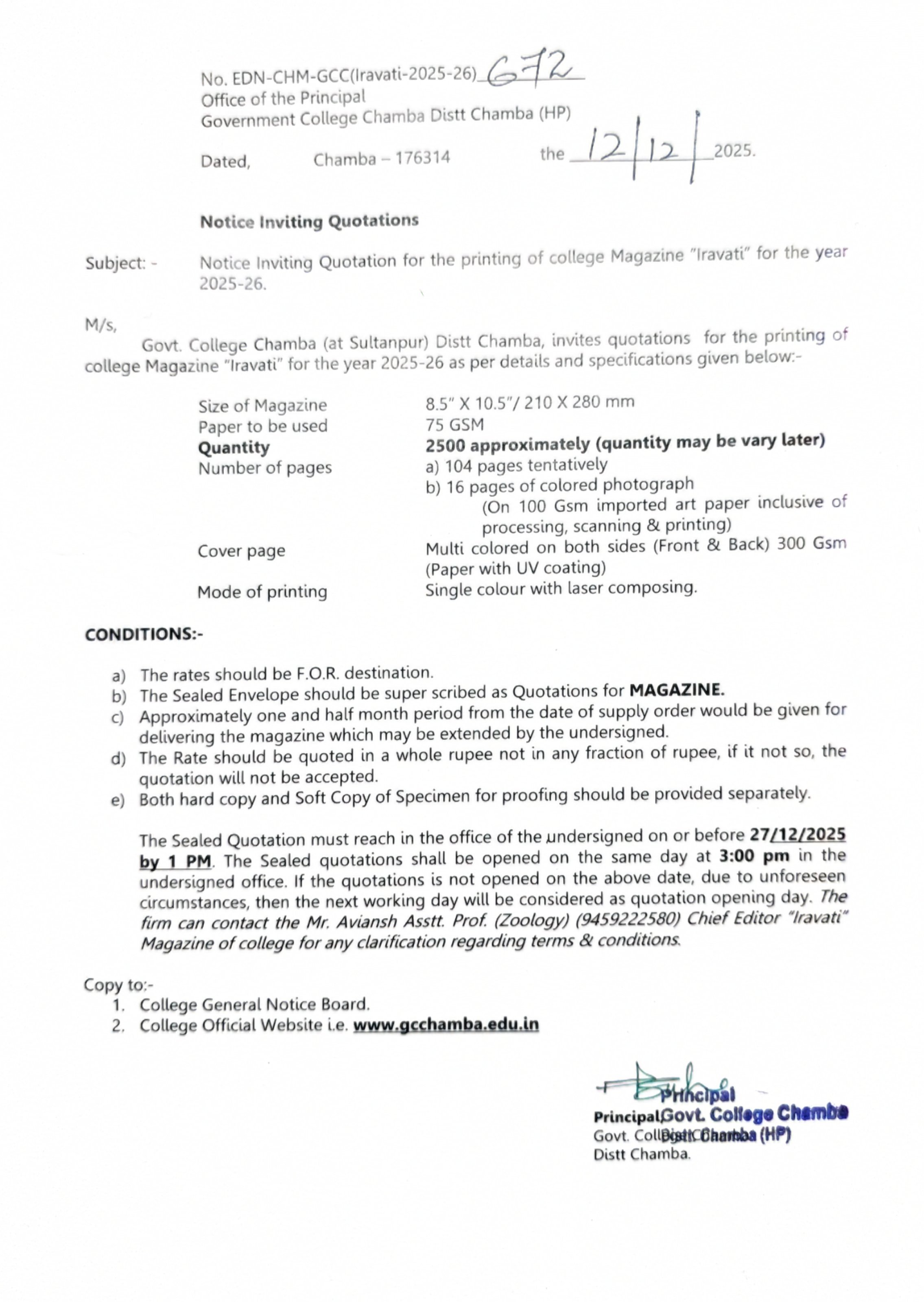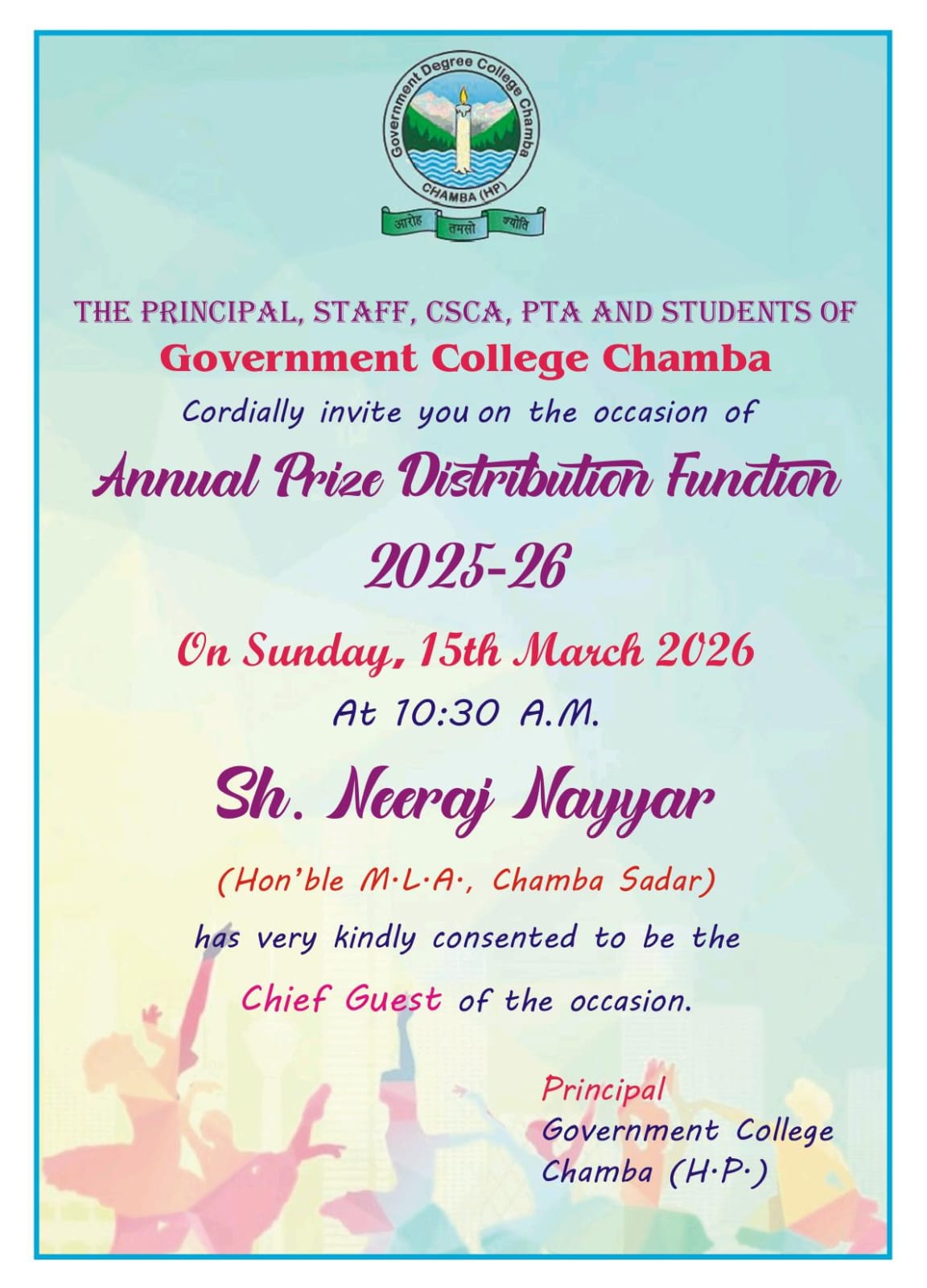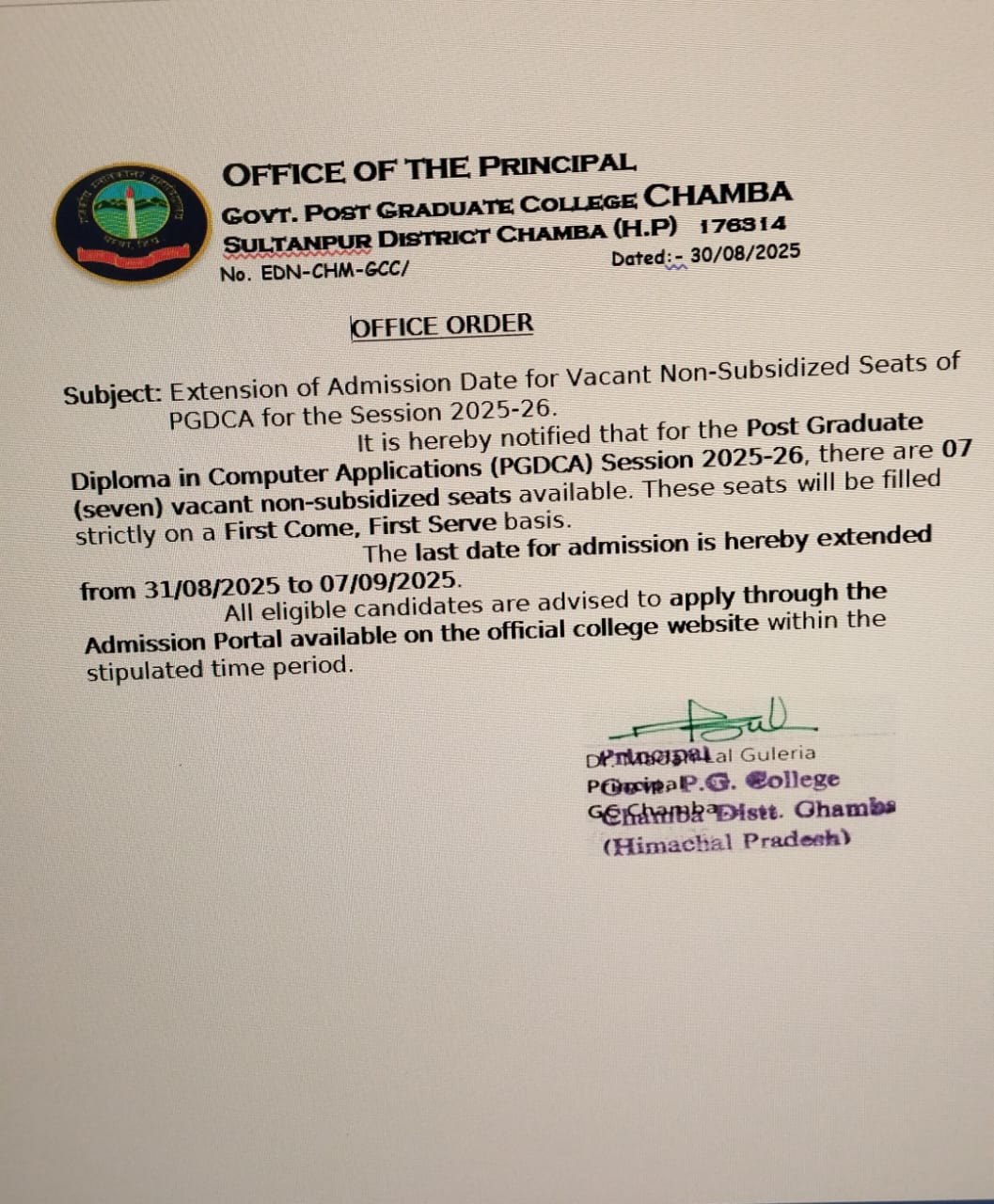 Government Degree college Chamba was established on 15th May, 1958 as a co-educational institution by the Government of Himachal Pradesh. The college has creative team of 67 faculty members and 4052 students enrolled in undergraduate and post-graduation programs in the session 2020-21. It is recognized by University Grants Commission, New Delhi under section 2(f) and 12B of UGC act 1956. The college is affiliated to Himachal Pradesh University, Shimla and all its currently running programs have been granted affiliation by it. In August, 2022 after due assessment it was reaccredited with Grade “B++” by NAAC.